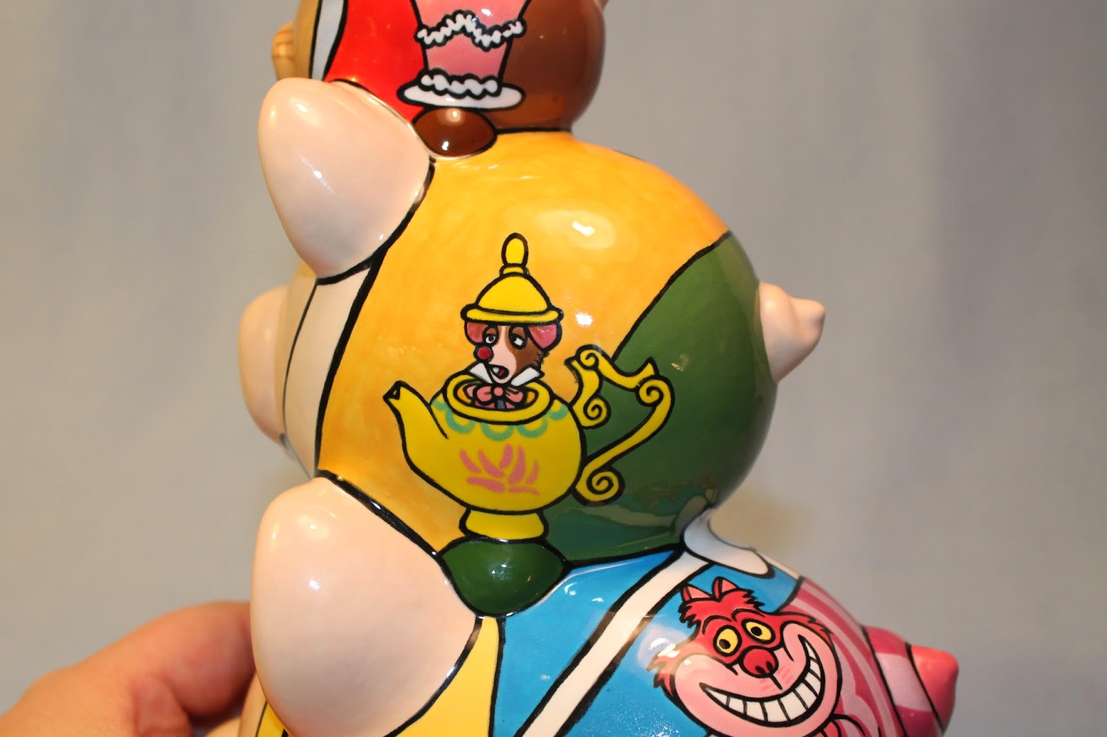 The three characters were the Ecksteins' idea and we decided to make Alice the largest pig, the Mad Hatter in the middle, and the March Hare on top. Plus, it helped add to the surprised look I gave Alice that they were on top of her!